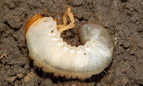 Grubs are 1/4” to 2″ depending on their age. They are creamy white, C-shaped, with tan heads and six legs. In Florida, grubs are a year-round problem. Their larvae hatch during the months of May and June. Grubs are the larval stage of beetles which have laid their eggs in the lawn. Grubs feed on the roots of turf grass, causing extensive damage. When grubs infest grass, it becomes thin, yellows, and eventually due to the damage to the root systems, the grass will die. The turf may feel soft and spongy in damaged areas. Scattered brown patches in the grass will appear, indicating dead areas with no root system. A grub infestation can quickly eradicate your lawn if left untreated.